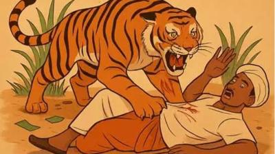 टाइगर का डरावना मंजर: शिकार के इंतजार में झाड़ियों में बैठा था खूनी बाघ, किसान दिखते ही टूट पड़ा – सेकंडों में बचाई जान