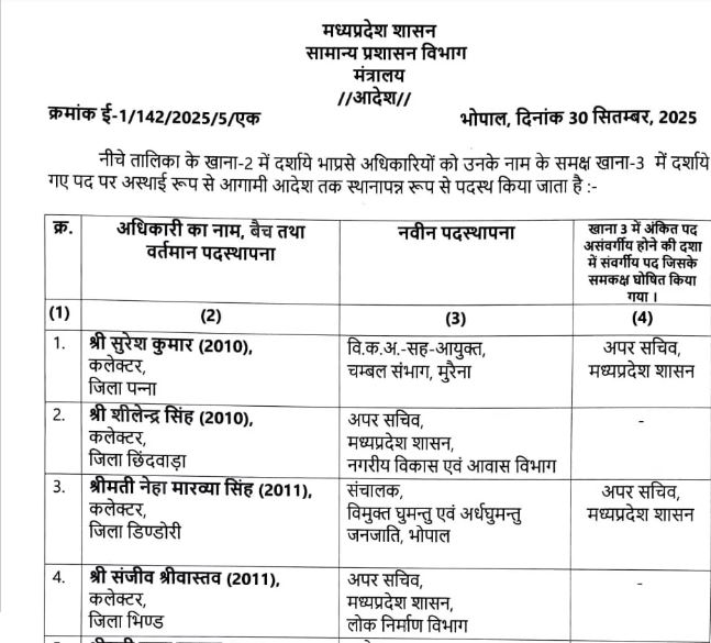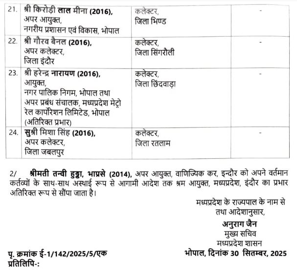 मोहन सरकार का बड़ा फैसला: 24 IAS अधिकारियों की जिम्मेदारियां बदलीं, 10 जिलों में नई तैनाती
