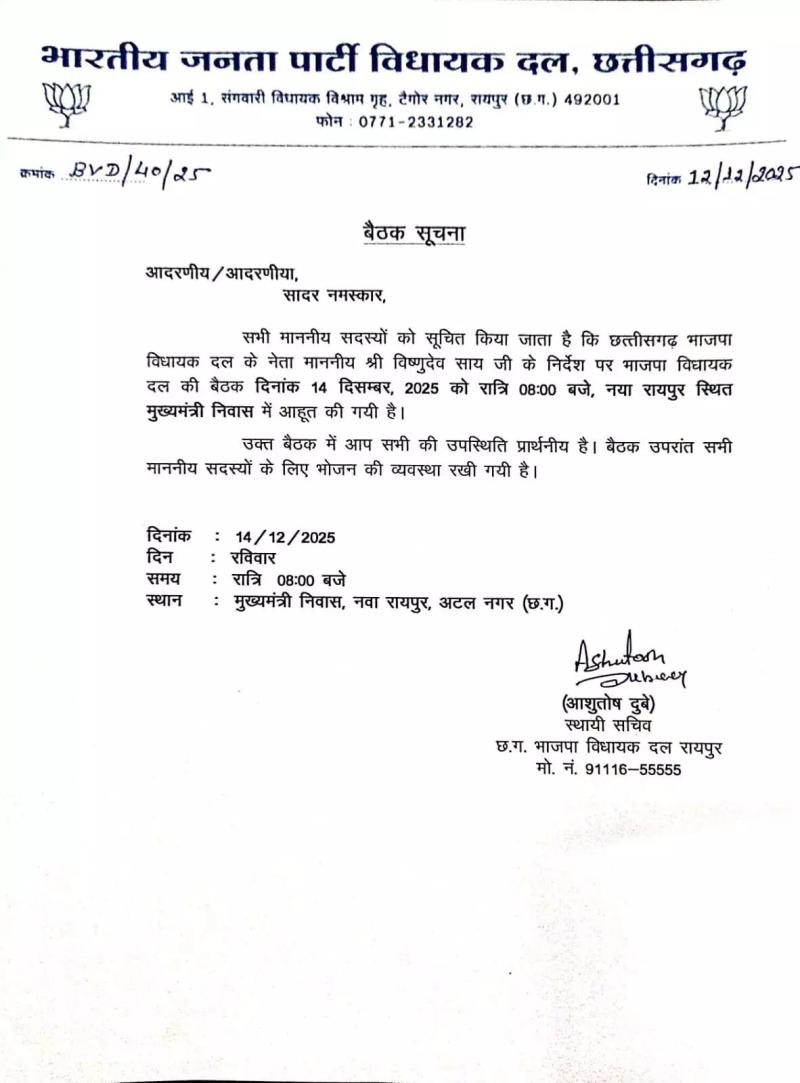 भाजपा विधायक दल के नेता और मुख्यमंत्री विष्णुदेव साय के निर्देश पर इस बैठक का आयोजन किया गया है। बैठक को लेकर जारी आधिकारिक सूचना पत्र में सभी माननीय विधायकों को सादर आमंत्रित किया गया है और उनकी उपस्थिति को आवश्यक बताया गया है। यह BJP Legislature Party Meeting संगठनात्मक दृष्टि से काफी महत्वपूर्ण मानी जा रही है।