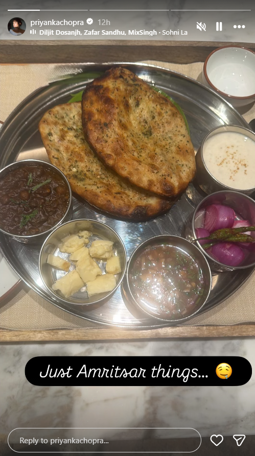 प्रियंका ने अपनी इंस्टाग्राम स्टोरी पर एक पारंपरिक पंजाबी थाली की तस्वीर शेयर की है। जिसमें अमृतसरी कुलचा, दही, दाल मखनी, छोले और ढेर सारे मक्खन के साथ बाकी खाने की लजीज चीजें दिख रही हैं। इस स्पेशल थाली की तस्वीर के साथ प्रियंका ने कैप्शन में लिखा, 'बस अमृतसर की बातें...' इस स्टोरी के साथ प्रियंका ने दिलजीत दोसांझ का गाना 'सोहणी लगदी' लगाया हुआ है।।