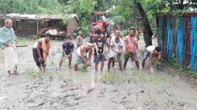 ग्रामीणों ने कीचड़ से सनी सड़क पर लगाया धान